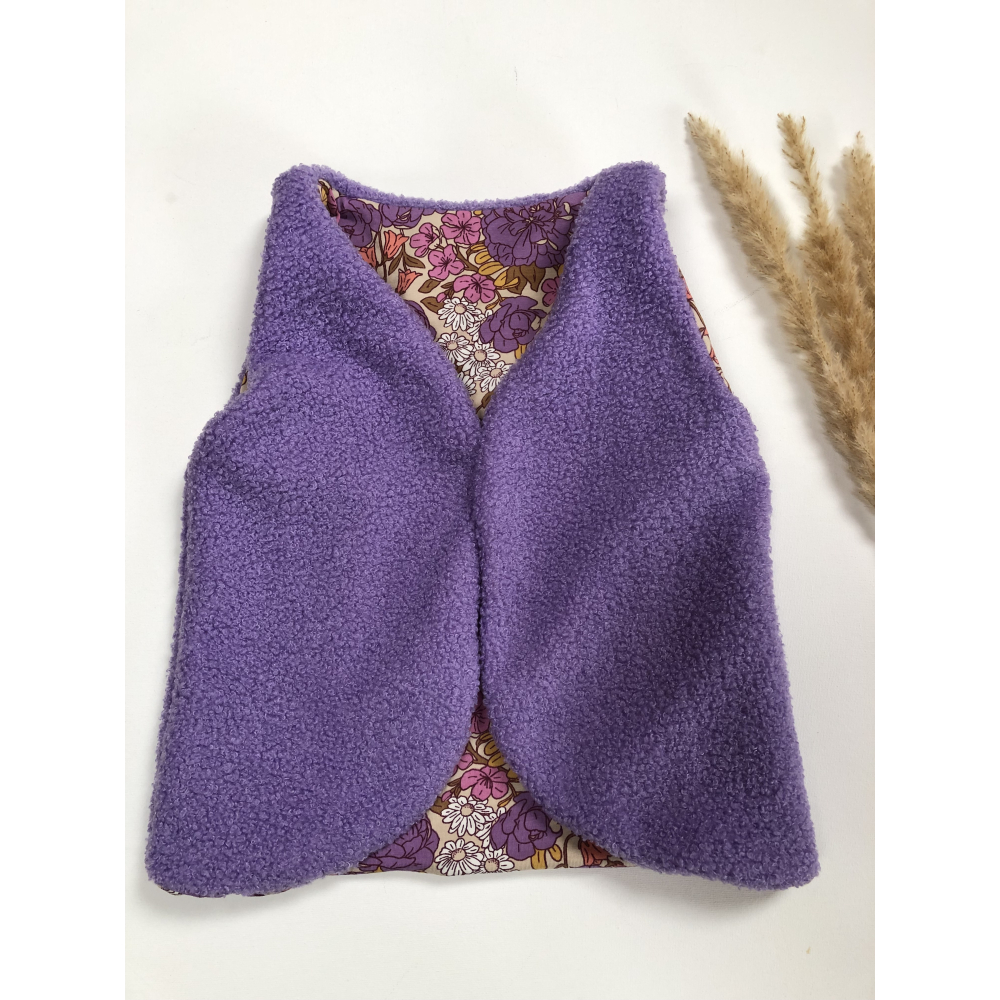 De binnenkant is gevoerd met een toffe bloemen print tricot stof. Je kunt de gilet aan twee kanten dragen. De binnenkant stof is ook als legging of flared verkrijgbaar en vind je met de naam broekje Indian Summer.